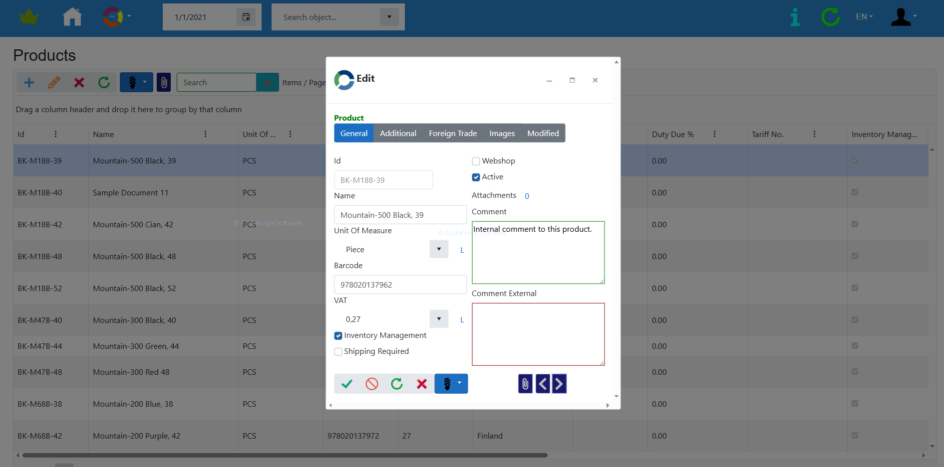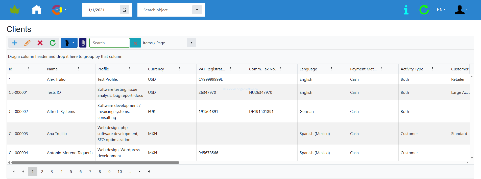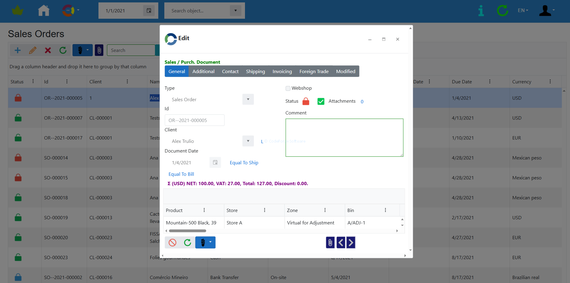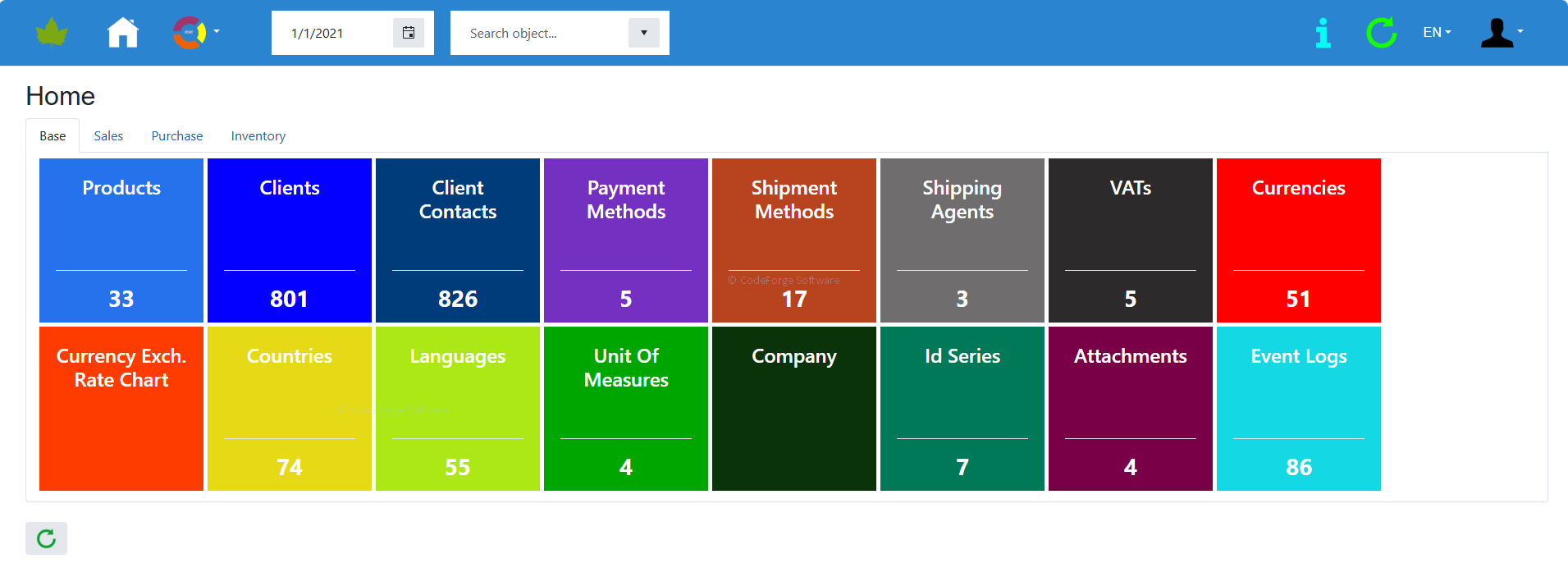 Functions: role-based permission management system, user-definable roles, multiple own company management, multi-language support, client and contact management, product management, unit of measure management, unit of measure conversation, multiple currency management, currency exchange rate and LCY calculations, auto-exchange rate loading, sales quote recording, sales order recording, purchase quote recording, purchase order recording, inventory management, inventory valuation (FIFO-based). Inventory adjustment. Dokumentumtár. Audit log, Data IO support in Microsoft Excel and XML formats.